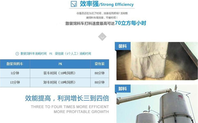散裝飼料車的優(yōu)勢: 散裝飼料的生產(chǎn)可實(shí)現(xiàn)直接生產(chǎn)直接裝車,隨產(chǎn)隨出,不需要進(jìn)行提前備貨,不占用倉儲設(shè)施,也不會出現(xiàn)停產(chǎn)等待拉料的現(xiàn)象,使飼料生產(chǎn)實(shí)現(xiàn)計(jì)劃管理,生產(chǎn)效率得到提升。 ★獨(dú)有倒梯形設(shè)計(jì),散裝飼料在罐體內(nèi)密封輸送,V字形罐體卸料順暢,減少飼料的耗損,保證質(zhì)量,避免污染。 ★運(yùn)輸比包裝成袋運(yùn)輸不但節(jié)省勞動力,而且成本較低。 ★可選電動卸料、全液壓卸料、氣卸為全自動上料卸料,可連續(xù)作業(yè),大大提高生產(chǎn)效率。 ★罐體內(nèi)可加裝分倉,可同時運(yùn)輸多種不同類的飼料或膨人介質(zhì)。部件標(biāo)準(zhǔn)化,容易維修保養(yǎng)。 頂部進(jìn)料倉