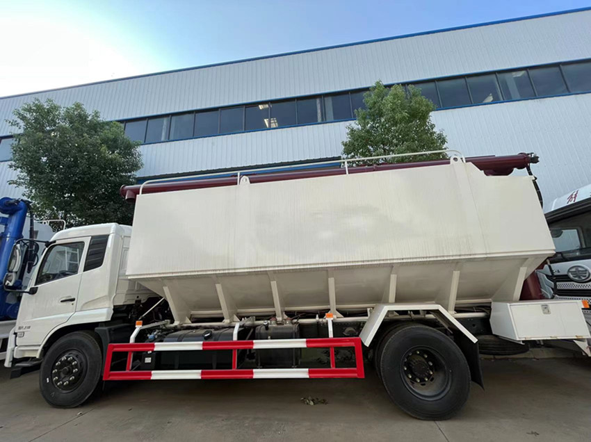 散裝飼料運輸車,散裝飼料車的飼料罐架設(shè)在卡車的底盤上,罐頂開有進料口.頂部的一根螺旋輸送卸料管(俗稱卸料絞龍)則可自由回轉(zhuǎn)和抬升,抬升的仰角可達60度。運輸時,頂部的螺旋管平臥在罐頂;卸料時則抬起,使管端的出料口與畜禽飼養(yǎng)場貯料罐頂部的進料門相接,駕駛室內(nèi)裝有操縱裝置(操縱裝置也可裝置在罐體尾部),卸料時通過車底的動力輸出軸和減速器來驅(qū)動螺旋,以完成卸料。
